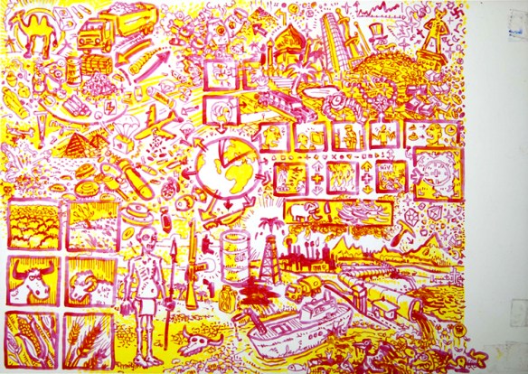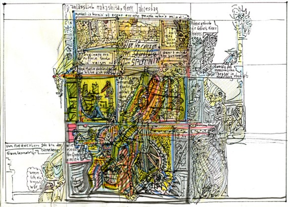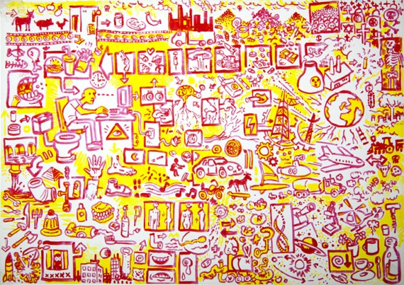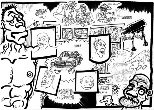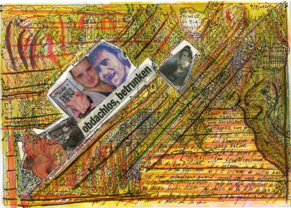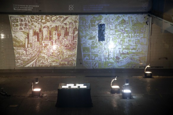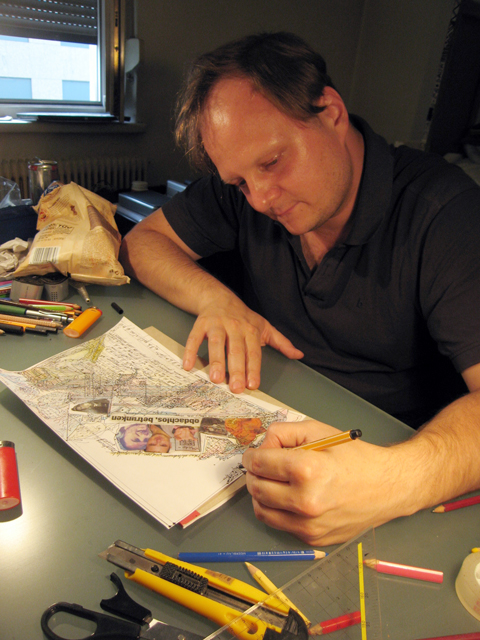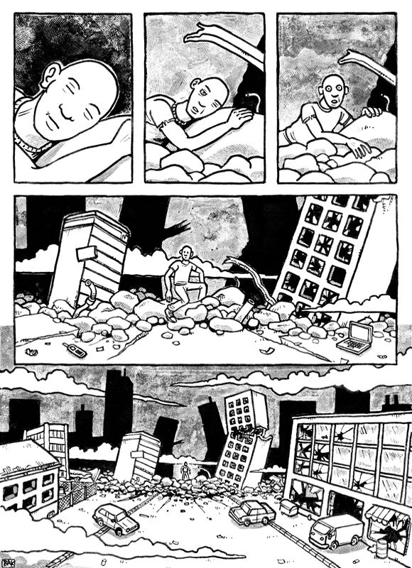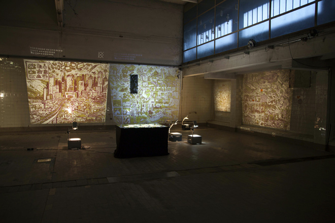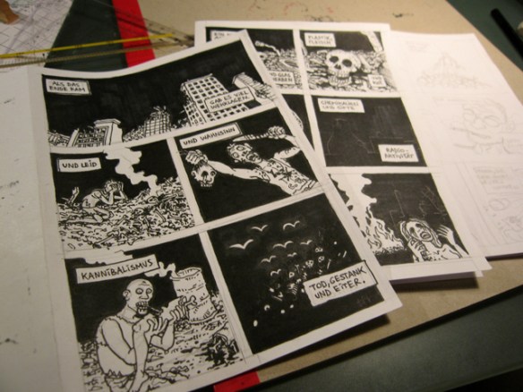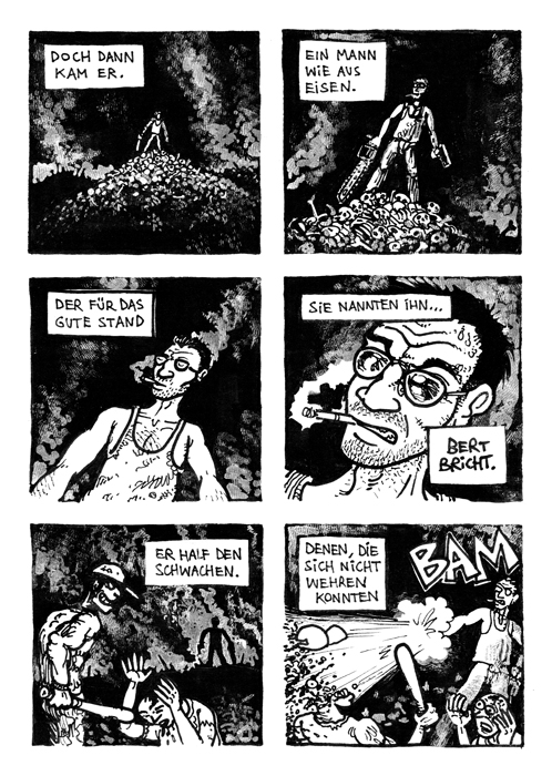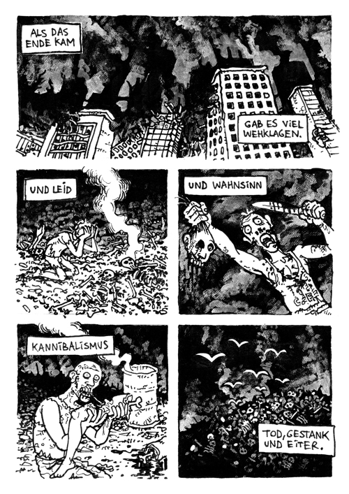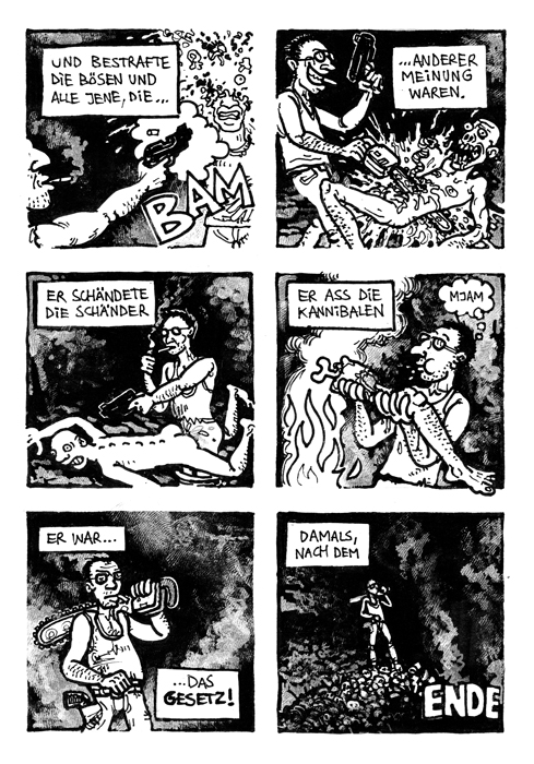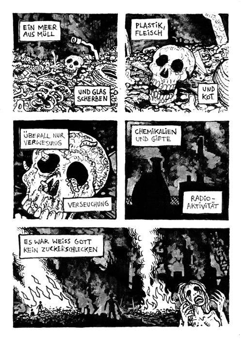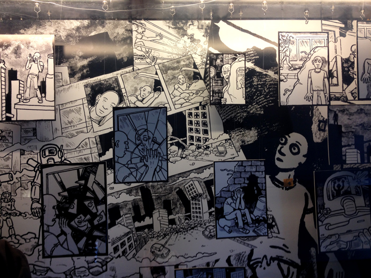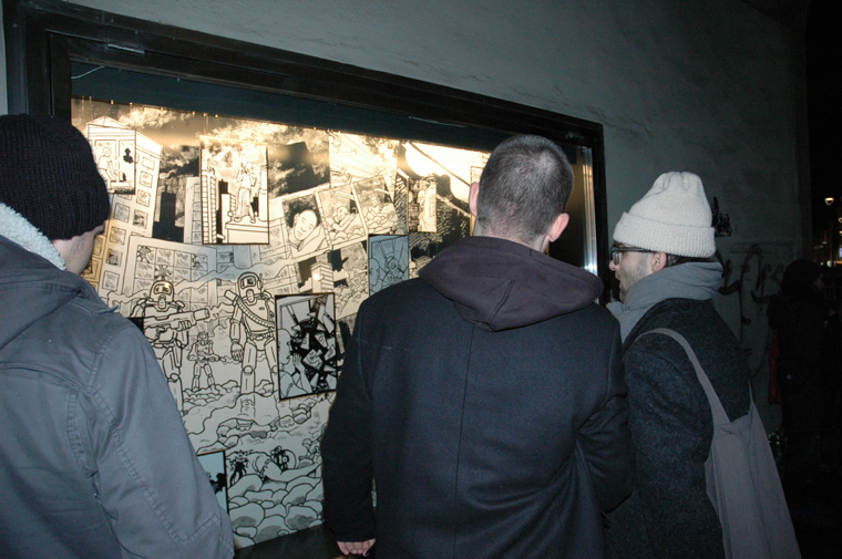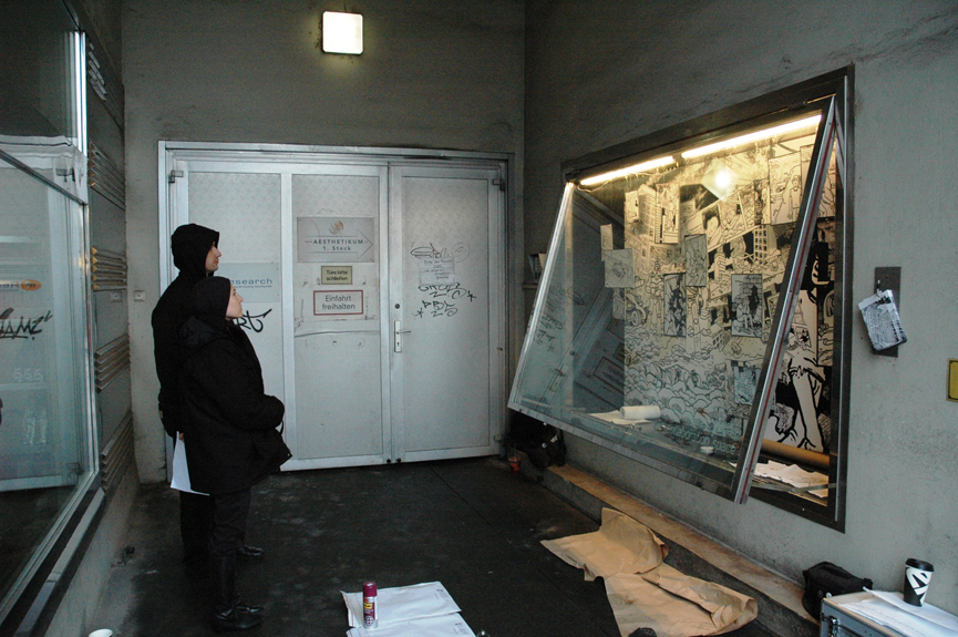 Ein achtseitiger, in sich geschlossener Comic, den Bertram Könighofer im September 2013 beim Comic-Seminar Erlangen produziert hat, bildet das Ausgangsmaterial für die Installation. Darin irrt ein namenloser Hauptdarsteller ohne Gedächtnis durch die Ruinen eines dystopisch-urbanen Environments, verursacht vom Ausbruch einer Epidemie – ein mysteriöses Virus, das Menschen in Monster verwandelt. Die Inszenierung im Schaufenster setzt sich zusammen aus gemeinsam mit Michaela Tomaselli ausgewählten, einzelnen Comic-Panels und Bildelementen und deren Neuanordnung hin zu einer Bildlandschaft. Die herkömmliche, lineare Erzählstruktur wird dadurch aufgebrochen, und der Comic so zu einer räumlich-grafischen Momentaufnahme, in der alles gleichzeitig geschieht. Anstelle einer einzelnen Geschichte entsteht ein Mosaik aus Eindrücken und Erzählsträngen – eine Vielzahl möglicher neuer Narrative, die vom jeweiligen Betrachter individuell konstruiert werden; ein Spiel mit der Wahrnehmung und eine Reflexion auf die Mechanismen medialer Berichterstattung, die in ihrer Selektion stets nur einen bestimmten Teil eines größeren Ganzen präsentiert. Der Betrachter wird Teil der Landschaft, die Geschichte des namen- und identitätslosen Protagonisten wird zu seiner eigenen.